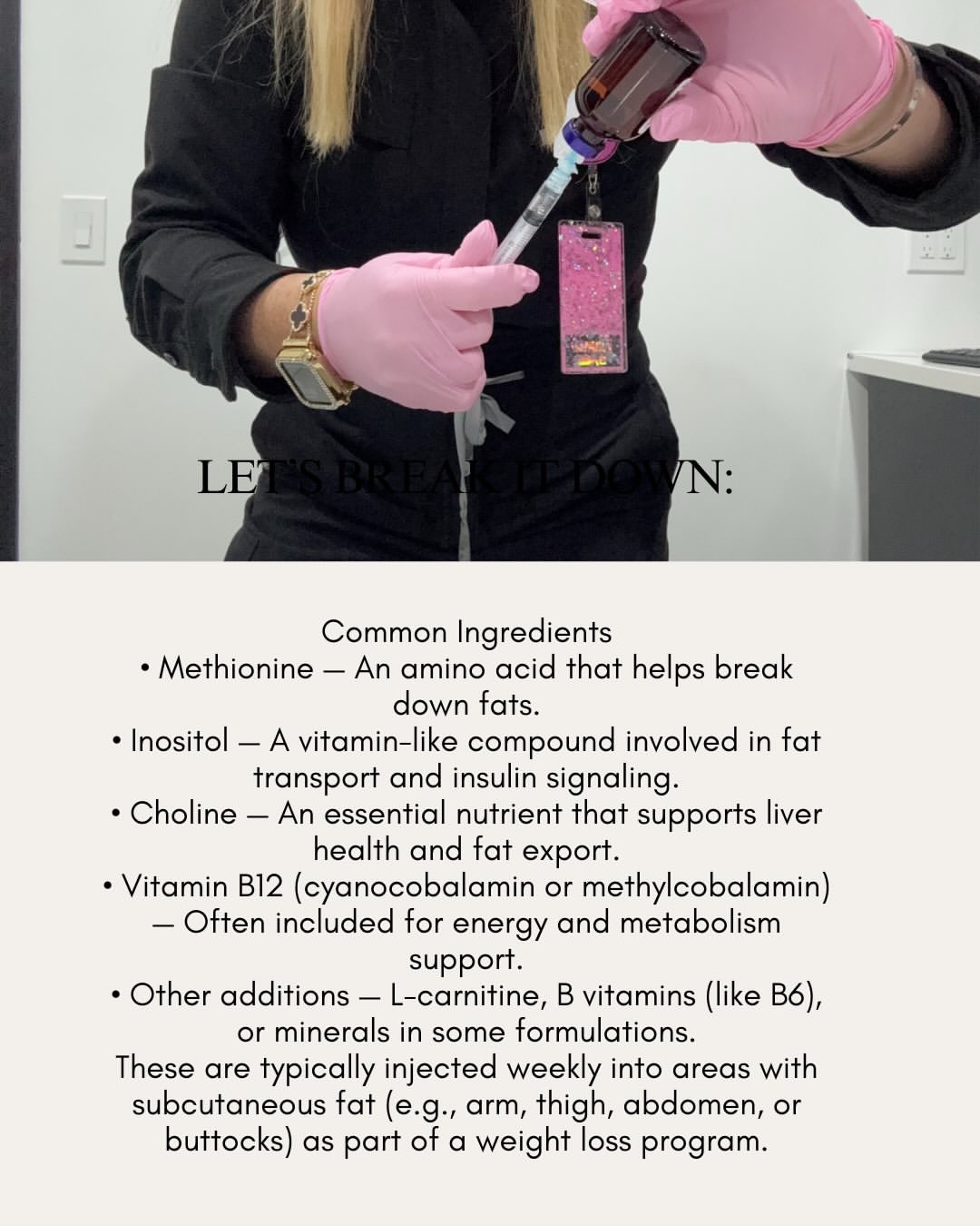 Fat burning injections, often referred to as Lipo B shots, MIC injections, or lipotropic injections, are nutrient based injections designed to support fat metabolism and energy production.